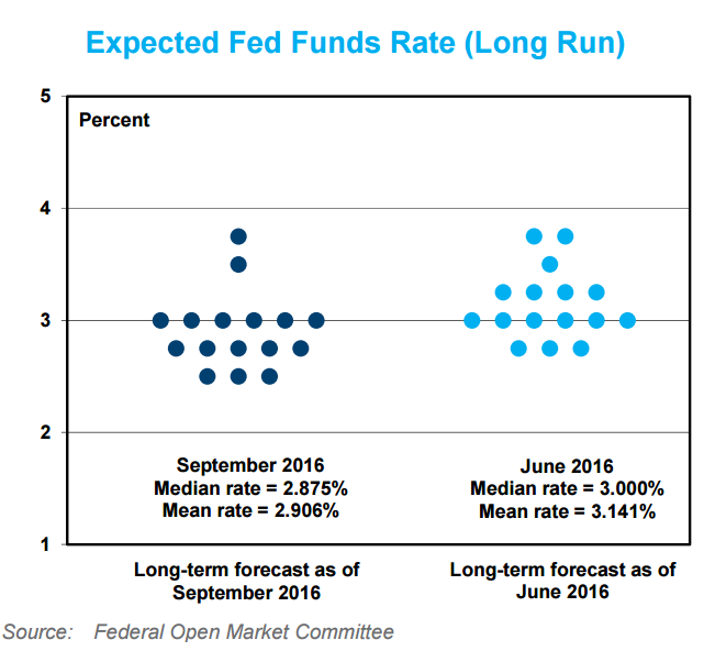The Committee was again more dovish with respect to the outlook for future policy than it was three months ago. The Committee’s median expectation for the Fed Funds Rate at end-2017 now implies just two hikes next year to 1.00-1.25 percent and just three hikes in 2018 to 1.75-2.00 percent. And the FOMC revised down its median assessment of the long-run equilibrium Fed Funds Rate for the fourth out of the past five forecast updates to below 3 percent.