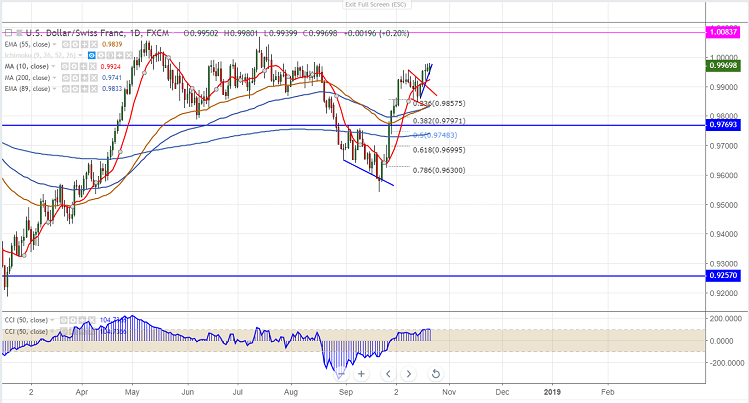 The broad based US dollar buying is the main reason for the jump. The geopolitical tensions between US and Saudi, Italy budget and Brexit will be supporting Swiss franc.