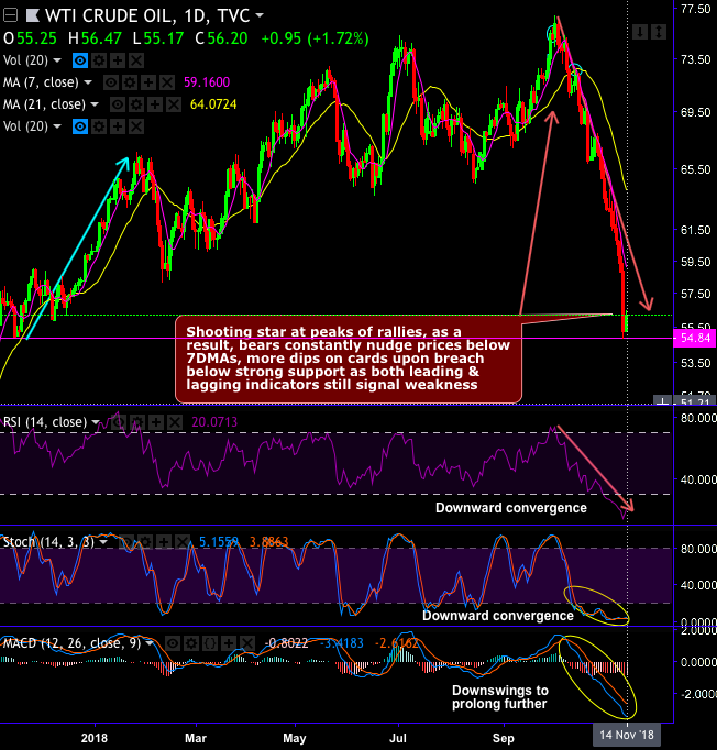 Well, ever since the WTI crude price chart formed shooting star at peaks of rallies, bears have constantly nudged prices below 7DMAs (refer daily chart), for now, more dips seem to be on cards upon breach below strong support as both leading & lagging indicators still signal weakness.
