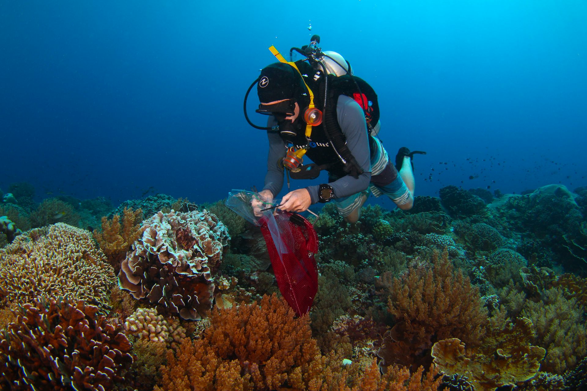 Lead author of the study Michael Fox collects coral tissue samples in the remote central Pacific Ocean. Brian Zgliczynski, Author provided
