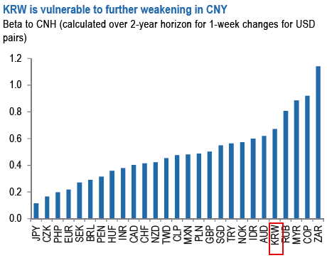 KRW is a notable candidate to short given that it has among the highest sensitivity in Asia to CNY weakness (see above chart).