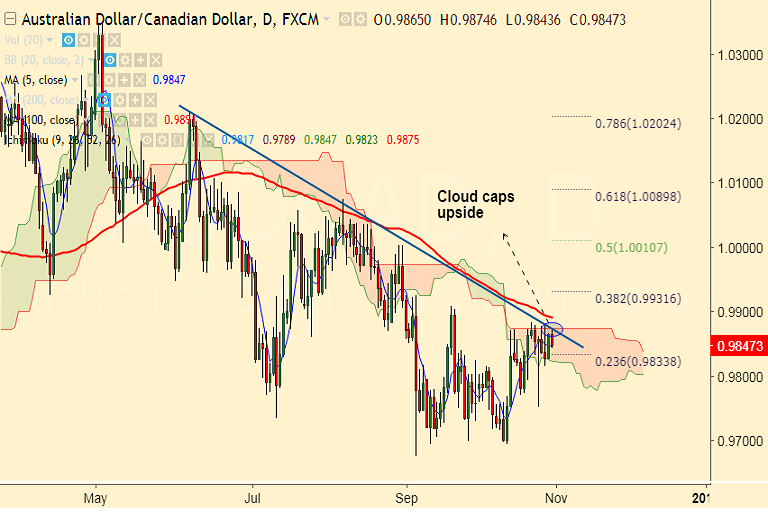 - Weekly 20-SMA at 0.9877 caps upside. Daily cloud at 0.9875 is stiff resistance for AUD/CAD, upside only on break above.