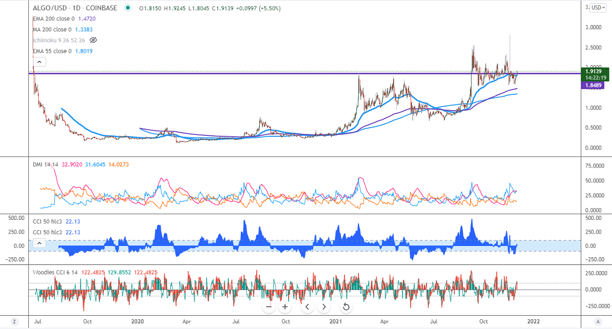 ALGOUSD lost more than 40% from its all-time high of $2.82. The overall trend is bullish as long as support $1.50 holds. It is currently trading around $1.9020.