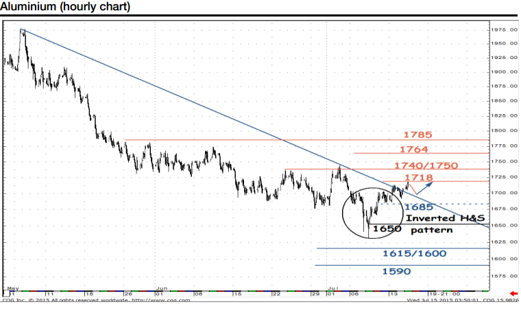 Aluminium has pulled back towards lower limit of multi-year downward pointing triangle 1650/1600. Monthly RSI is holding a horizontal support suggesting 1650/1600 is a relevant support zone. Multiyear trend at 1750/1785 should cap any rebound and ability to sustain above should decide the extension of recovery.
