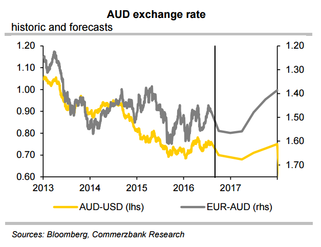 In reaction to the notable appreciation of AUD since the start of the year, the Reserve Bank of Australia (RBA) has reacted in May and as recently as in August and lowered its key rate by 25bp respectively to a historic low of now 1.50 percent. Despite the rate cuts, the RBA was unable to reverse the currency effect. The Australian dollar is up around 11 percent against its US counterpart since the beginning of 2016.