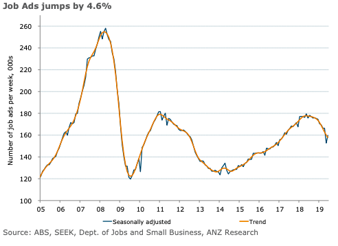 "Job ads in June jumped 4.6 percent, reversing a bit more than half of the sharp drop in May. The gain was one of the biggest in 18 months. We don’t think it necessarily represents a turn in the overall downward trend, however. Job ads plunged more than 8 percent in May as a result of the timing of the election and the late April ‘holiday year’ effect (when Easter and ANZAC Day were close together). The subsequent jump in job ads in June represents only a partial recovery from that weakness, suggesting that the overall trend is still downwards. This points to slowing employment growth and rising unemployment. If confirmed by the actual employment data, then the RBA will likely react by lowering the cash rate yet again," said David Plank, ANZ’s Head of Australian Economics.