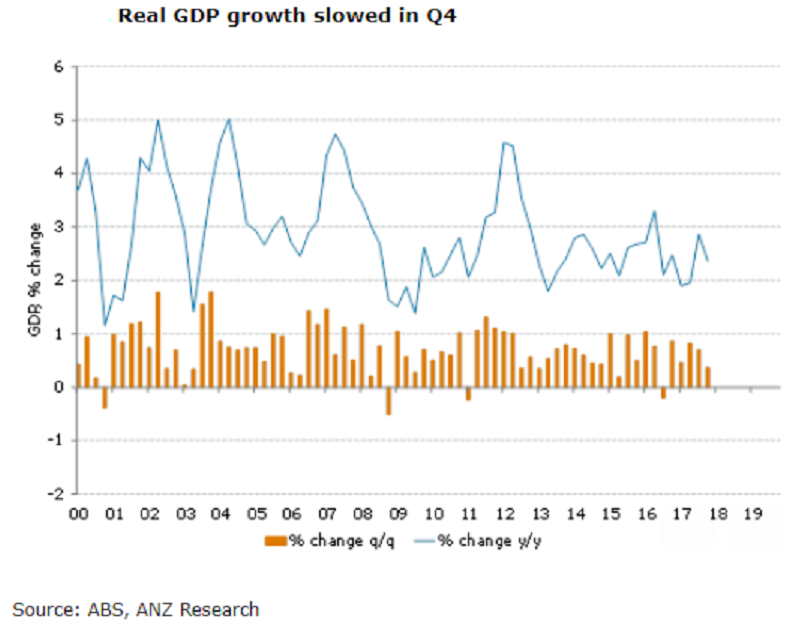 GDP was up a modest 0.4 percent q/q in Q4, bringing annual growth down to 2.4 percent. For 2017 as a whole, GDP rose 2.3 percent, which is the slowest annual average rate of growth since 2013. The result was in line with ANZ research’s forecasts but a touch below market estimates and the RBA’s forecast published in the February Statement on Monetary Policy.