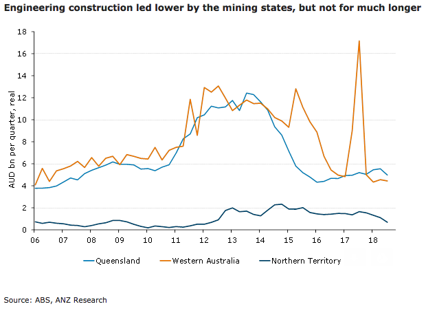 The largest driver of the decline in overall construction was privately funded engineering construction (-7.5 percent q/q). The biggest fall in total engineering was in the Northern Territory (-40 percent); this is expected to largely reflect the ongoing drop-off in mining investment as the Ichthys project nears completion.