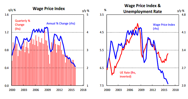 RBA lowered its main interest rate to 1.75% from 2% at its May 5th meeting and cut its Dec-16 inflation forecasts by a full percentage point in its quarterly Statement of Monetary Policy (SoMP) that followed. RBA’s inflation forecasts are centered on changing dynamics in wages and unit labour costs. The minutes released this week highlighted the Bank’s uncertainty over the inflation outlook, and its concerns about the second-round impact of lower inflation on wages growth.
