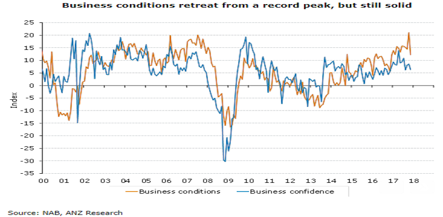 Australian business conditions fell sharply in November, but this should be viewed in the context of a retreat away from the all-time record level reached in October. Conditions still look fairly solid and continue to bump around the best levels since the GFC.