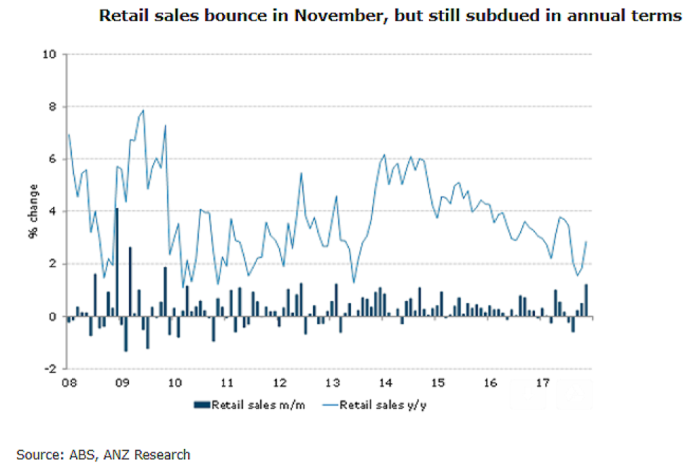 Australia’s retail sales for the month of November recorded its strongest monthly rise since a similar gain in February 2013, underpinned by the release of the iPhone X and increasing popularity of Black Friday and associated sales. However, the figures have largely shrugged-off the jump in petrol prices for the month, which was thought to dampen the sales relative to the consensus expectation.