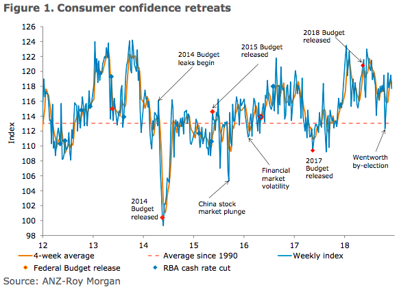 "A more cautious RBA statement on Tuesday and then the soft Q3 GDP figures Wednesday may have impacted consumer views on current economic conditions, which fell a sharp 6 percent. Global equity volatility may also have impacted sentiment. On the other hand, current financial conditions were only down a touch after a very strong gain the previous week and future financial conditions were up. This suggests consumers are still feeling good about their own circumstances, which is somewhat at odds with the weak wage data in the Q3 GDP report," said David Plank, Head of Australian Economics, ANZ Research.