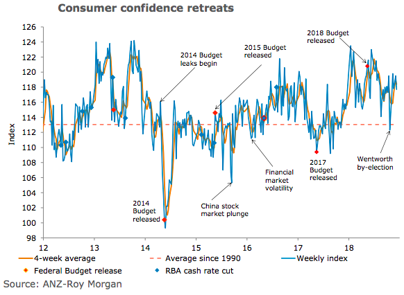 "A more cautious RBA statement on Tuesday and then the soft Q3 GDP figures Wednesday may have impacted consumer views on current economic conditions, which fell a sharp 6 percent. Global equity volatility may also have impacted sentiment. On the other hand, current financial conditions were only down a touch after a very strong gain the previous week and future financial conditions were up. This suggests consumers are still feeling good about their own circumstances, which is somewhat at odds with the weak wage data in the Q3 GDP report," said David Plank, Head of Australian Economics, ANZ Research.
