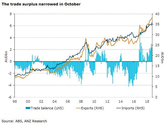 Australia’s trade balance for the month of October deteriorated, owing to improvements in imports of capital goods and intermediate goods, which is consistent with the solid pipeline of business investment and government infrastructure projects. Export growth was supported by a large increase the value of coal exports.