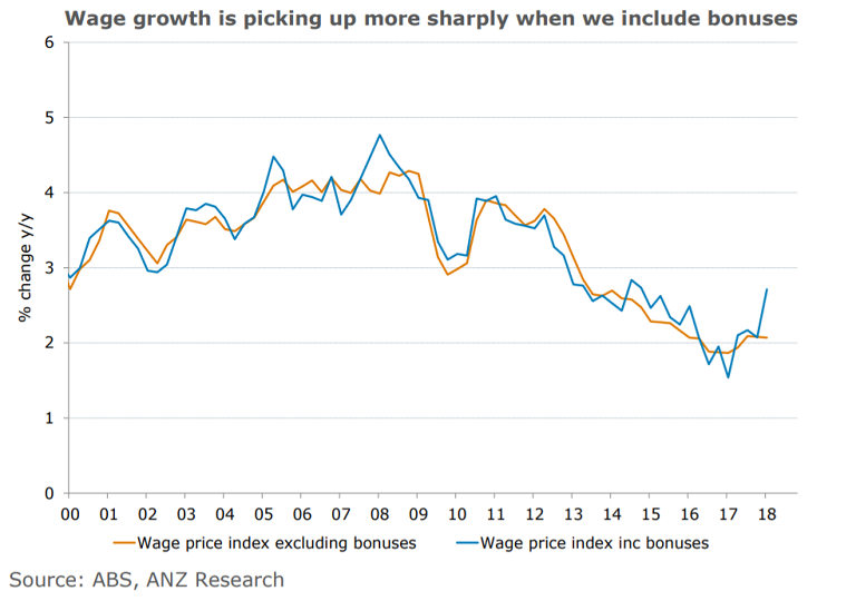 The WPI is a measure of changes in ordinary hourly rates of pay and excludes hours worked, bonuses, superannuation and penalty payments. Firms are paying higher bonuses, and growth in the WPI including bonuses has accelerated sharply recently, to 2.7% y/y, suggesting businesses are paying a higher wage bill but are reluctant to locking in higher costs indefinitely.