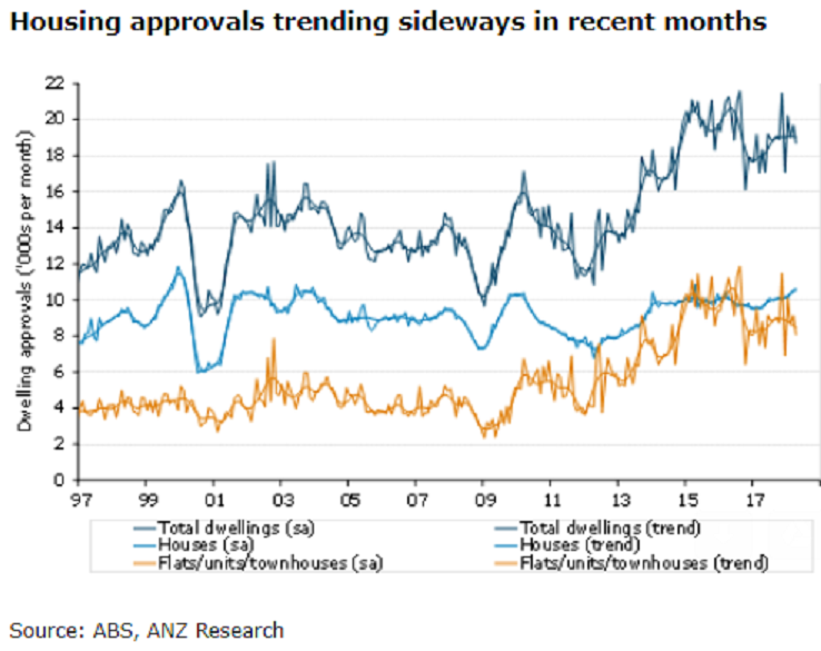 "We are more concerned about the decline in non-residential building approvals. Monthly approvals are now 20 percent lower than a year ago and are trending lower across most types of property (with the clear exception of accommodation). While the strength in approvals of offices and industrial property in 2017 suggests that activity should remain elevated in the near term, the recent downturn in approvals is challenging our outlook for ongoing strength in non-residential activity into 2019," ANZ Research commented in its latest report.