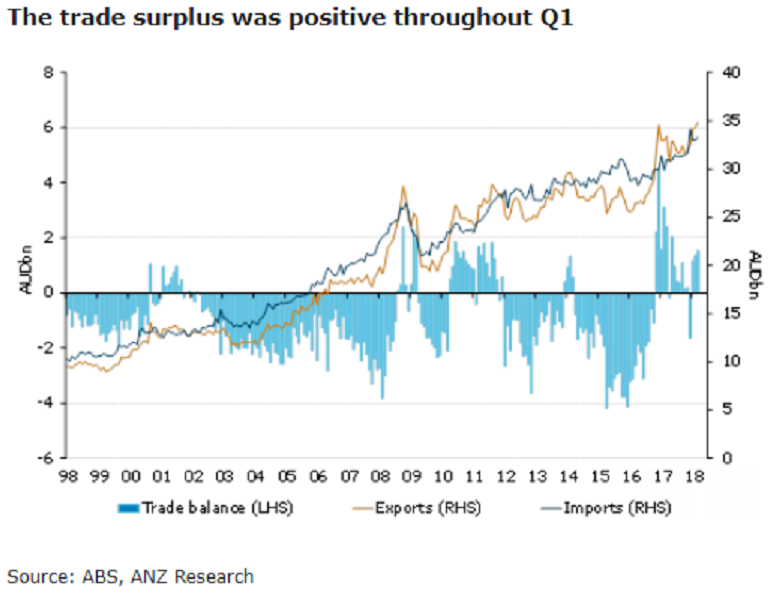 The trade balance improved in March to AUD1,527 million. Notable was the large upward revision in February’s surplus to AUD1,349 million (from an initial estimate of AUD825 million). March’s improvement was driven by the rise in total exports slightly outpacing the rise in total imports.