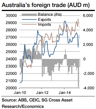 On the import side we already have the ABS' estimate of goods imports at -4.6% mom, and along with our estimate of services imports, a decline of around 4.2% mom is expected. On the export side a strong recovery is expected due to the 17% mom increase in the iron price in China (Port of Qingdao), says Societe Generale.