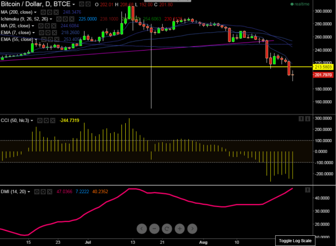 BTC/USD has broken major support $211 and declined till $192 from that level. Short term trend is bearish as long as resistance $220 holds.