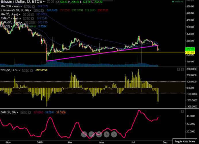 BTC/USD has broken major support $248 (200 day MA) and declined till $220 It is currently trading at $232. Short term trend is bearish as long as resistance $247 holds.