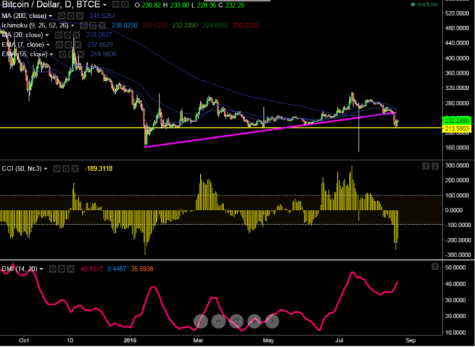 BTC/USD has broken major support $248 (200 day MA) and declined till $211. It is currently trading at $232. Short term trend is bearish as long as resistance $247 holds.