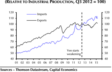 The strength in exports is easily explained by the gains in price competitiveness gains caused by the plunge in the yen, even though the impact took longer to materialise than many had anticipated. Export volumes have been rising relative to domestic production since early last year. Another reason for the weakness in import volumes is that energy import volumes have continued to decline even though the first nuclear reactor has yet to resume operations.