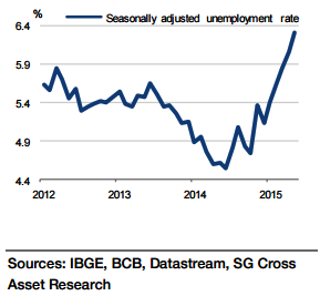 While non-seasonally adjusted data shows Brazil unemployment rate falling to 4.3% in December 2014 and rising to 6.9% through June 2015, seasonally-adjusted series suggests the unemployment rate actually bottomed at 4.5% in June 2014 and has risen to 6.4% since then.