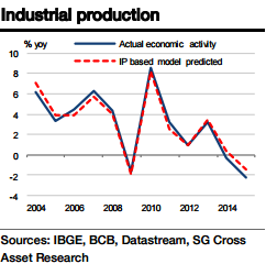 Assuming the same IP rate sustains as per first four months for the rest of the year, Brazil's supply side economic activity index should fall by -1.5% in 2015. However, year-to-date economic activity has collapsed slightly more than predicted by the model and continues to add to the downside risks to our growth forecast although economy might do slightly better in H2.