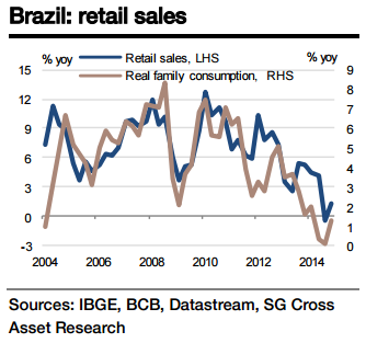"The sharp rise in inflation and unemployment suggests sales growth likely fell to -0.9% yoy (-1.0% mom) in February. Given the continued deterioration in the labour market and outlook for social security benefits, our forecast of 0.9% consumption growth in 2015 could be slightly optimistic", said Societe Generale in a report on Tuesday.