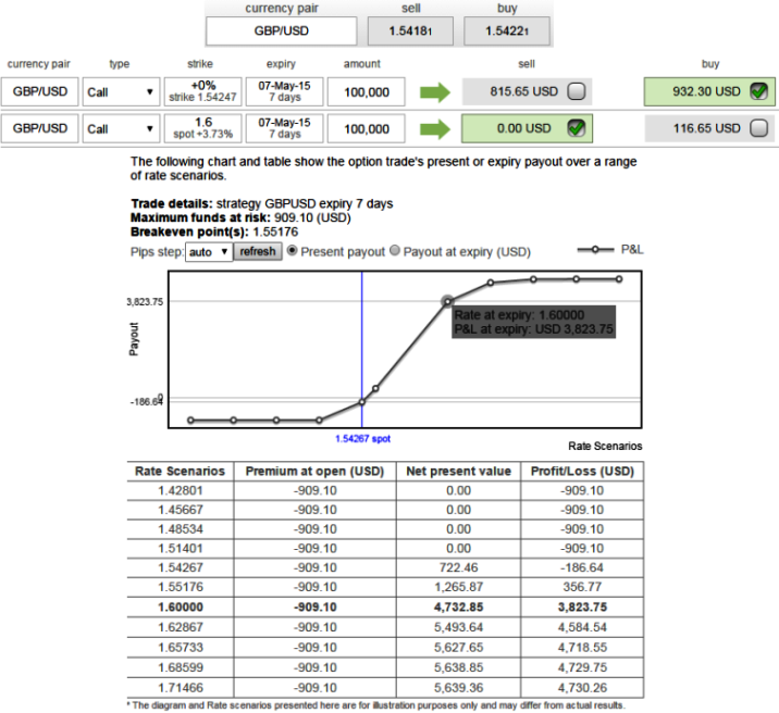 This is worth using a Bull Call Spread over a long call when the cost of the long call is too high (like in the above explanation, high premium scenario owing to UK election) and the underlying currency is expected to move somewhat higher.