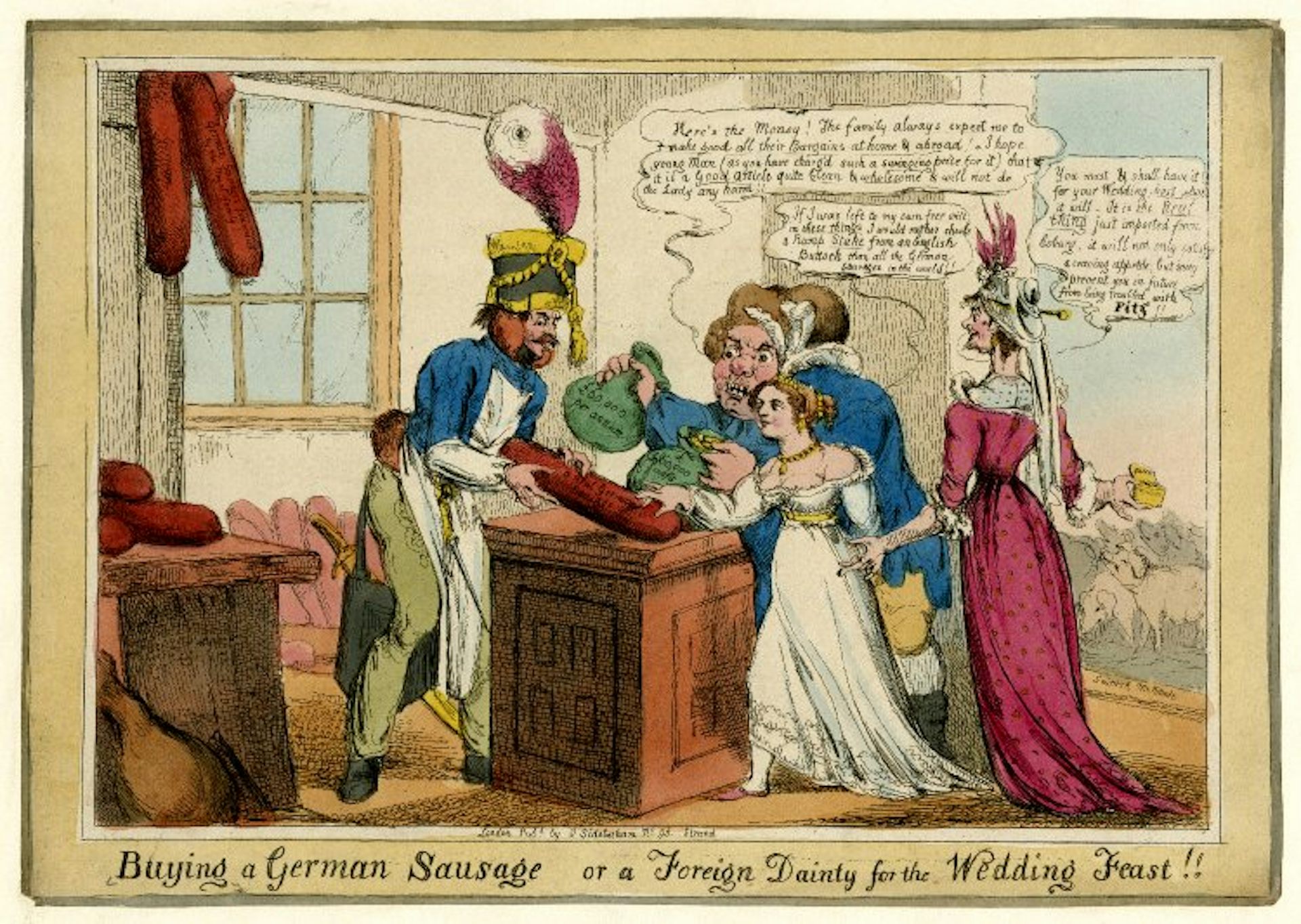 Buying a German Sausage, or a Foreign Dainty for the Wedding Feast by J Sidebotham (1818) © The Trustees of the British Museum