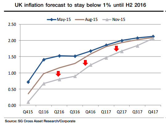 The BoE now believes UK inflation will stay below 1% until H2 2016 on account of sterling appreciation, lower commodity prices and downside risks to economic growth from emerging markets. Inflation was previously expected to return above 1% from Q2 next year. The forecast is based on a first increase in rates in Q2 2017 compared to the August forecast of Q3 2016.