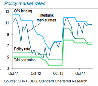 "We think the CBRT will leave the three interest rates unchanged at tomorrow's MPC meeting and might tweak (after recent remarks flagging such changes) the reserve option coefficients and/or required reserve ratios (to adjust the FX/TRY liquidity), but these measures have proven to have only marginal effects" said Standard Chartered in a report on Tuesday