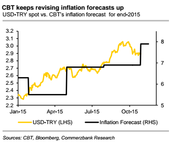 CBT released its Q4 Inflation Report yesterday, once again nudging up inflation forecasts by a sharp 1pp: from 6.9% to 7.9% for end-2015 and from 5.5% to 6.5% for end-2016. This is disappointing, though unsurprising - disappointing because CBT seems to have no game plan despite having to revise inflation forecasts steadily up; unsurprising because September data had already shown core inflation jumping past 8.2%, after which no one believed that the old target could be met.