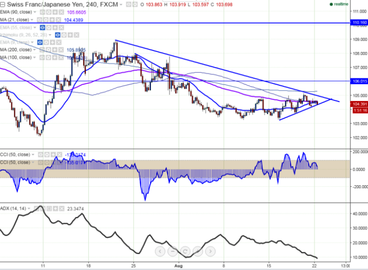 - CHFJPY is facing strong resistance around 105.30 (200- 4H MA) and any slight bullishness can be seen only above that level. It is currently trading around 104.38.