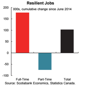 A small rise in jobs during May is possible in the wake of a moderate drop the prior month but what-goes-down-must-go-up logic is rather unsatisfying in the absence of any useful job market indicators in advance. The growth in total employment, particularly in full-time jobs, has been fairly resilient since oil prices peaked last summer . That may not be particularly surprising since the energy sector represents only about 5% of total employment in Canada including indirect effects in light of the capital-intensive but relatively labour-light nature of the industry.