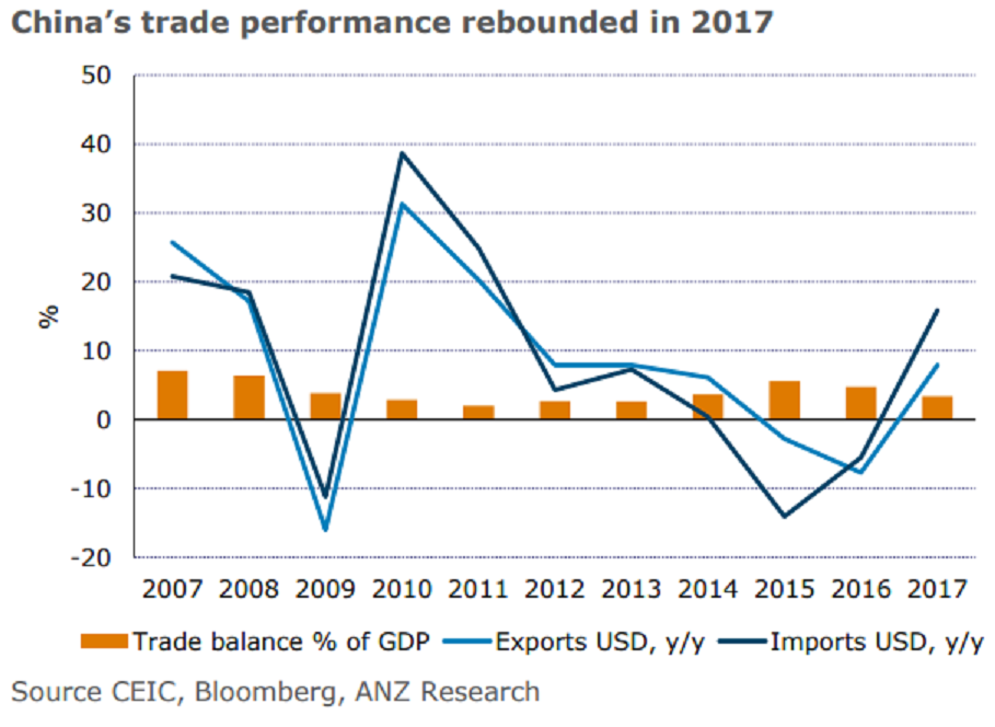 "Uncertainty surrounding Sino-US trade ties might be a key potential downside risk in the near term. While we remain comfortable about China’s export outlook for 2018, there are still uncertainties about Sino-US trade ties which may suddenly erupt," ANZ Research commented in its latest report.