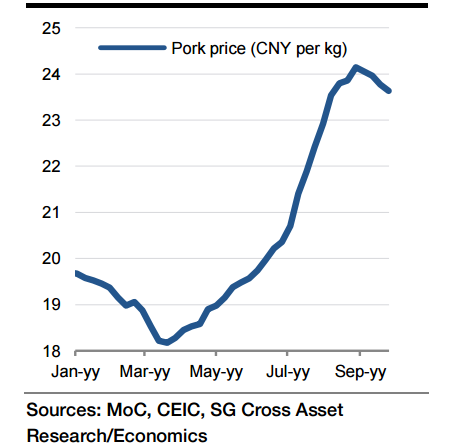 China's CPI inflation strengthened to 2% yoy in August from 1.6% yoy in the previous month. This was purely driven by stronger food inflation that increased by 1pp to 3.7% yoy, mainly on the back of higher pork prices. Non-food inflation remained unchanged at 1.1% yoy. That said, pork prices have declined slightly since the beginning of September. Agricultural product prices dropped over the same period. Therefore, food price inflation is expected to have softened from 3.8% yoy in August.