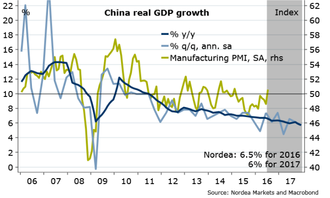 China’s economic growth is expected to moderate in the second half of 2016 as the aid from monetary easing in 2015 will gradually diminish and as housing market is beginning to ease, noted Nordea Bank in a research report. The economic growth stabilization seen in the second quarter is unlikely to sustain through 2016.