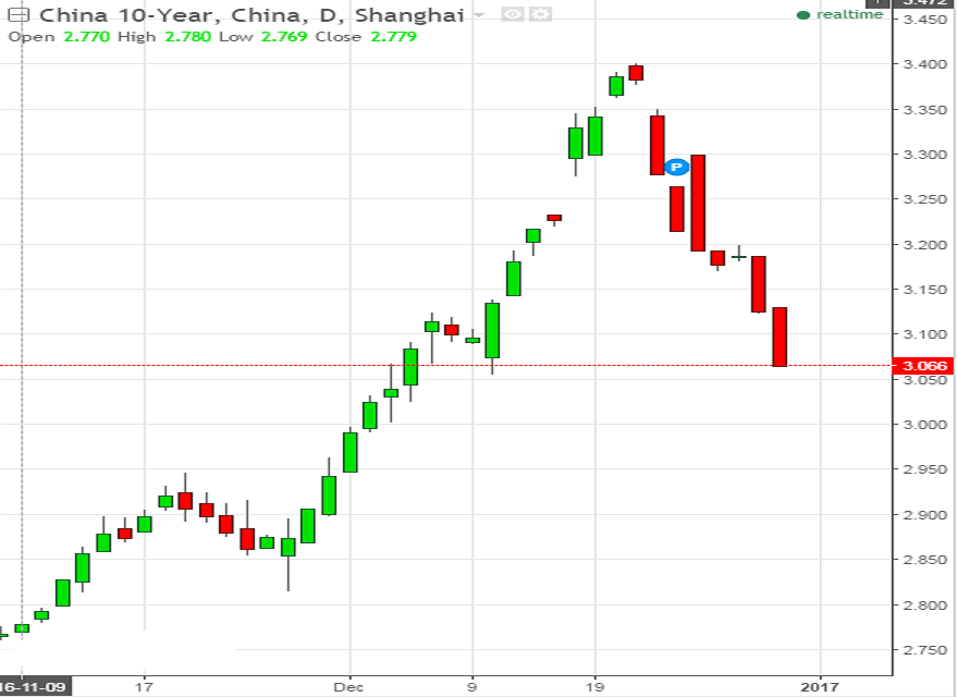 The Chinese 10-year sovereign bond yields hit lowest in December as investors poured into safe-haven instruments amid rising concerns that the country may witness subdued GDP growth with the country unwilling to raise more debt to boost its economy.