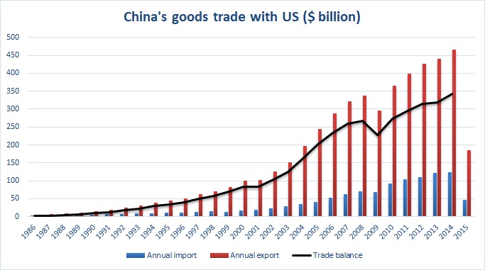 - It is not difficult to visualize, how rapidly Chinese yearly exports (goods) to US rose from $100 billion in 2000 to $466 billion by end of 2014. There has been just one year (2009), when the exports actually shrank.
