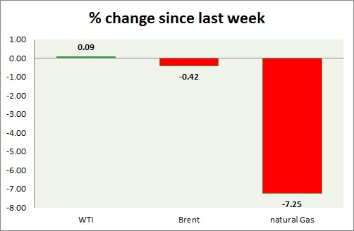 Energy pack is mixed, gas is up, oil is down. Weekly performance at a glance in chart & table.