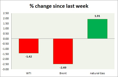 Energy pack is mixed, while gas is up oil is down. Weekly performance at a glance in chart & table.