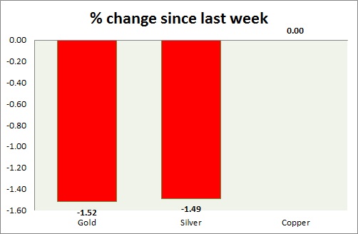 Metal pack is down on stronger Dollar today. Performance this week at a glance in chart & table -