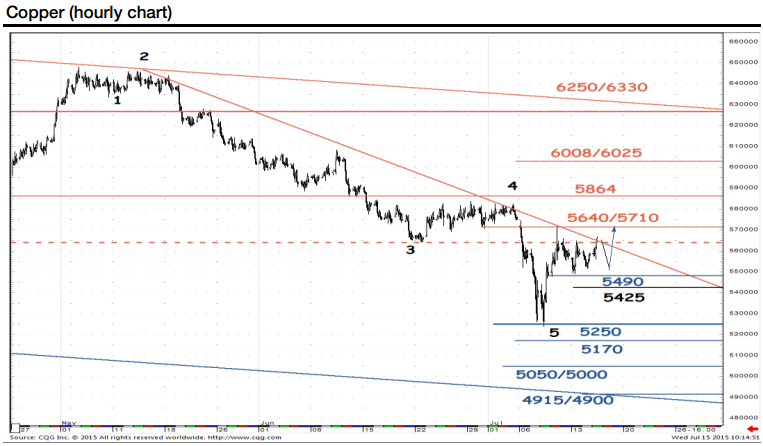 Copper pierced 15Y trend (5550 levels) but failed to sustain below. A bottom may well have been made at 5250, 2007 low and a projected target for the 5th wave (Elliott) of cycle that started in early May. Decisive resistance zone is at 5640/5710, a break past will mean extension of rebound towards retracement levels of 5864 and 6008.