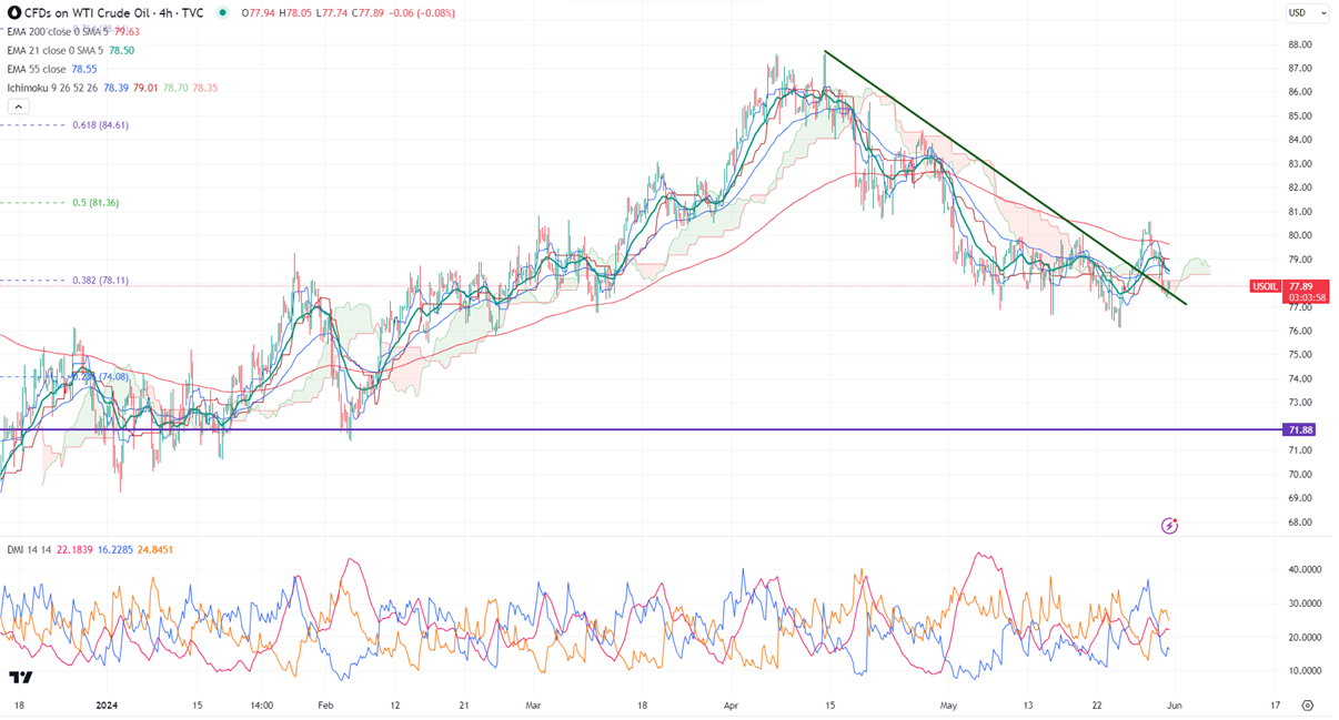 WTI crude oil declined as Fed officials confirms no rate cut in near term.It hit a low of $77.43 at the time of writing and is currently trading at $77.96.
