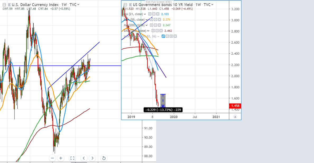 US 10 year bond yield continues to trade lower and lost more than 12% in the past two trading days after dovish comment from Fed Chairman. It is currently trading at 1.458%. The yield curve between US 10 year and 2 year got inverted which increases the chance of recession.