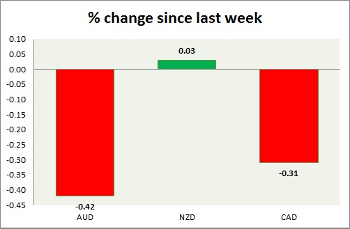 Strength meter (since last week) - Aussie -0.42%, Kiwi +0.03%, Loonie -0.31%.