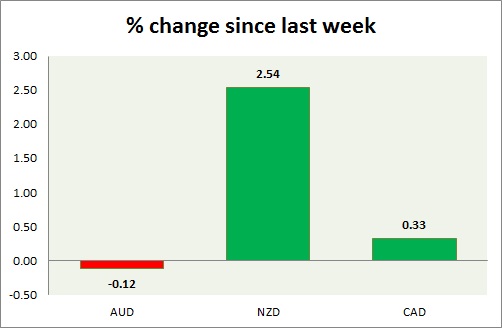 Strength meter (since last week) - Aussie -0.12%, Kiwi +2.54%, Loonie +0.33%.