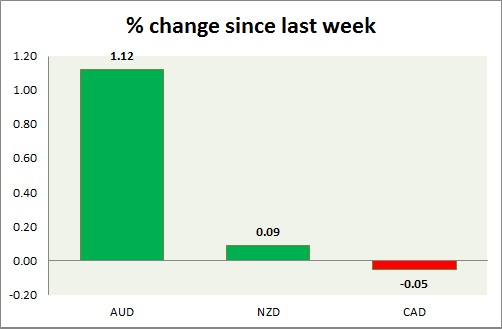 Strength meter (since last week) - Aussie +1.12%, Kiwi +0.09%, Loonie -0.05%.